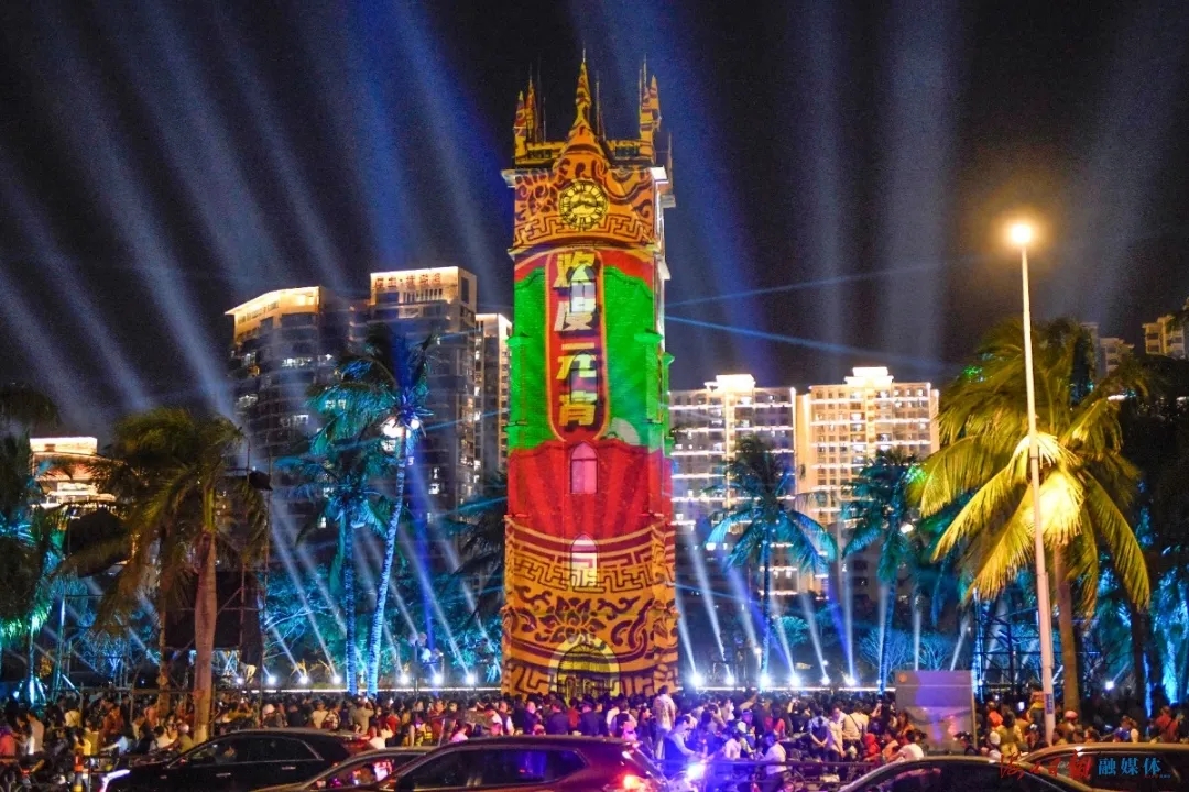 海口钟楼,历史悠久,跨越近百年时光,早已成为海口市内最重要的标志性建筑物之一。“龙华区积极打造夜间休闲娱乐文化,围绕钟楼、骑楼、海口湾片区点亮市民夜生活,从而让市民得到更多幸福感、获得感。”龙华区旅文局局长符文介绍,《光景·钟楼》从大年三十开始以来,到正月十五,累计6万余人次市民游客参观,正月十五当晚达到高潮,四场演出现场观众约5000余人。