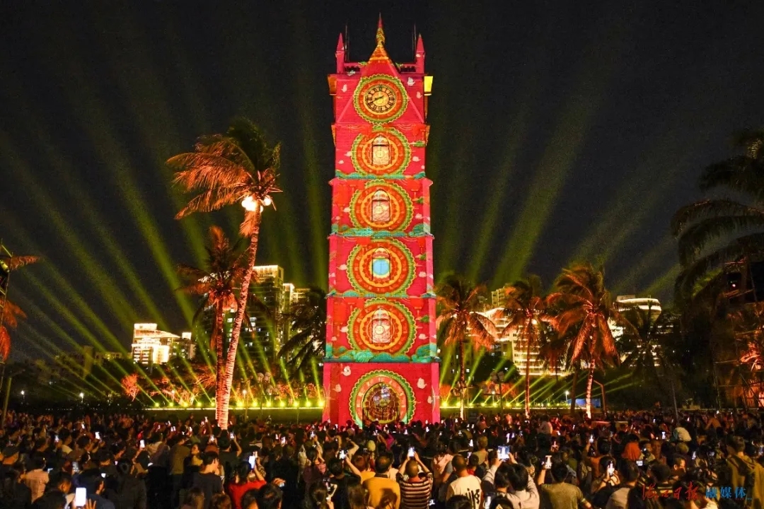 椰风树影下,一座古老钟楼,在历史文化与现代光影艺术的交融中,向人们诉说着一个个动人的浪漫故事……2月26日晚,大型光影秀《光景·钟楼》元宵节专场圆满收官,绚丽多彩、栩栩如生的光影秀演出吸引诸多市民游客前往观看。