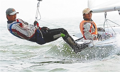 2005年,参加男子470级奥林匹克航线赛的海南队选手邓道坤与王伟东在比赛中。 王黎刚 摄