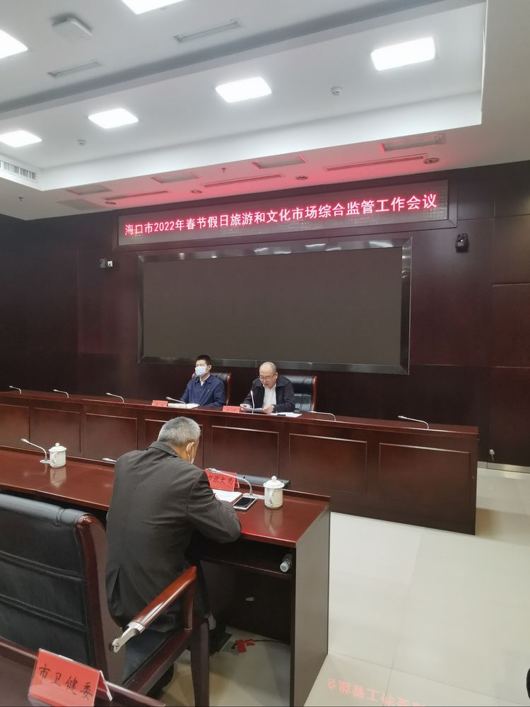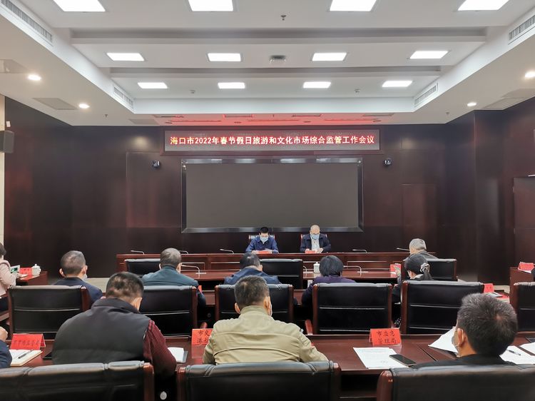 1月13日下午, 继全省2022年春节假日旅游和文化市场综合监管电视电话会议后,海口市旅游市场综合整治办和市旅游联席办迅速行动,立即召开海口市2022年春节假日旅游和文化市场综合监管工作会议,市政府副市长黄舸、市委宣传部、市委网信办、四个区政府、桂林洋开发区、市农业农村局、市人劳局、市旅文局、市商务局、市卫健委、市公安局、市市场监管局、市住建局、市司法局、市市政管理局、市交通港航局、市林业局、市应急管理局、市政务管理局、市气象局、团市委、市中级人民法院、市检察院、海口海事局和市消防支队等单位领导,重点旅游企业及旅游行业协会负责人参加会议。