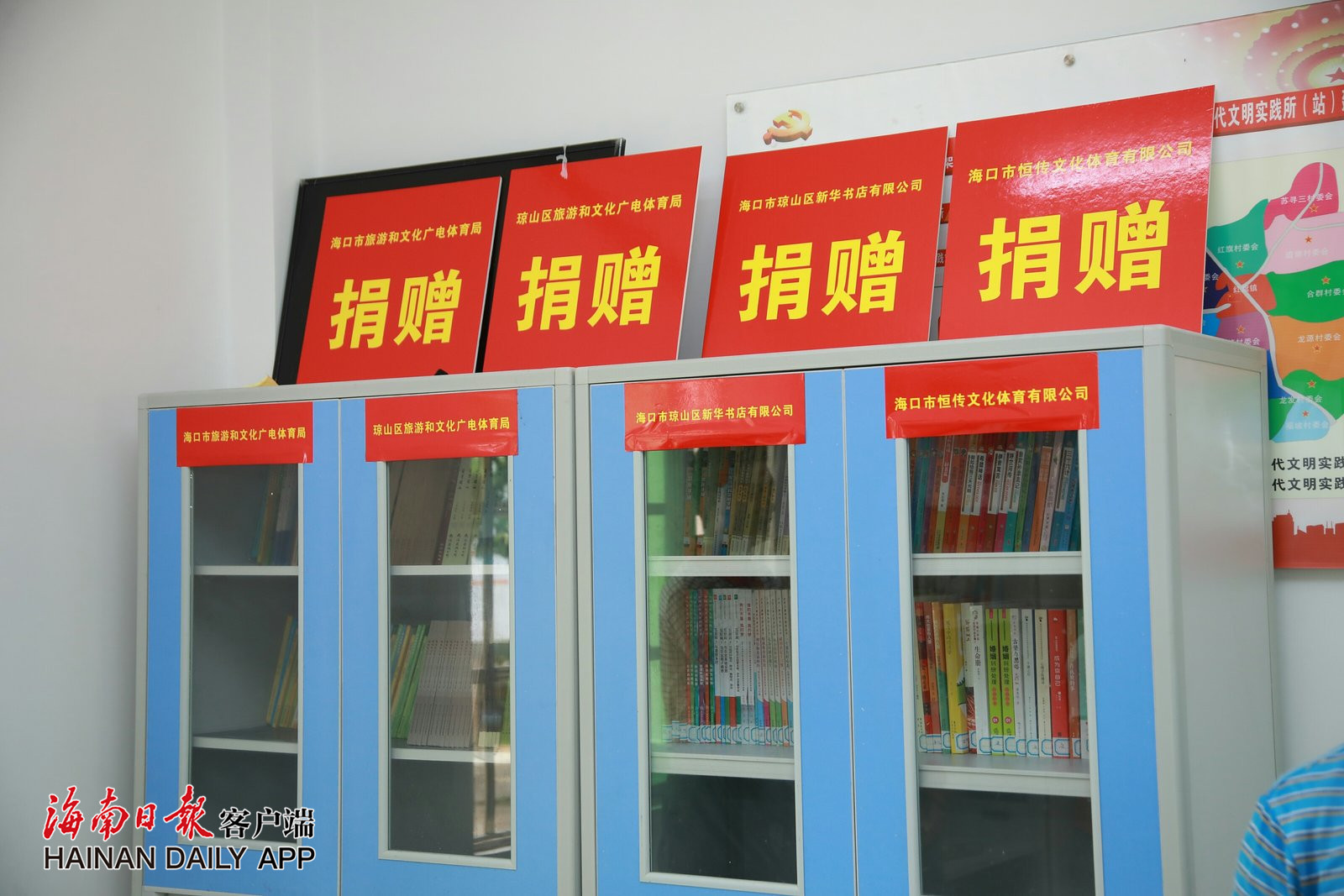 ↑社会各界爱心人士为海口市琼山区红旗镇本务村赠送图书。