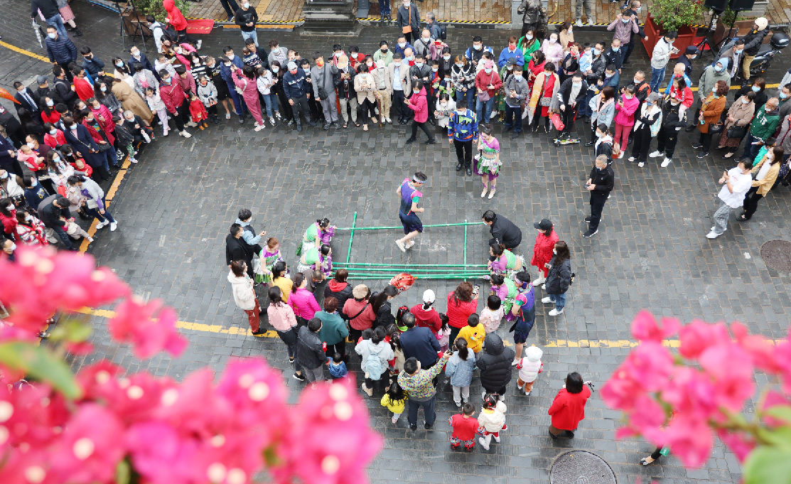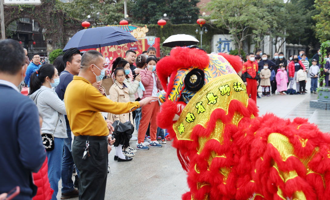 只见它们身着彩色霞披,时而跳跃、时而回头低顾、时而摇头摆尾,千姿百态,妙趣横生,一起互动拜年。市民游客们也纷纷上前摸摸狮头、碰碰狮尾,沾沾新年的福气。其中有不少家庭带着老人、孩子一起游公社看演出。
