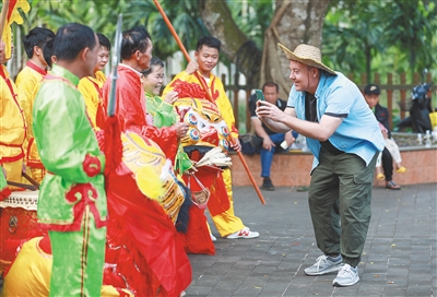1月16日,在海口市美兰区三江镇美敏村,海南国际传播中心“海外传播官”汤米·科尔曼(右一)在拍摄海南虎舞演出。