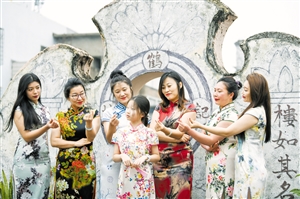 ①女游客们穿起旗袍在海口骑楼老街的一家民宿内拍照留念。