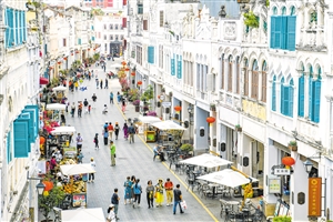 ④海口骑楼老街聚集了文创、轻食、民宿等业态,已成为游客的网红打卡点。图为海口骑楼老街中山路游客如织。