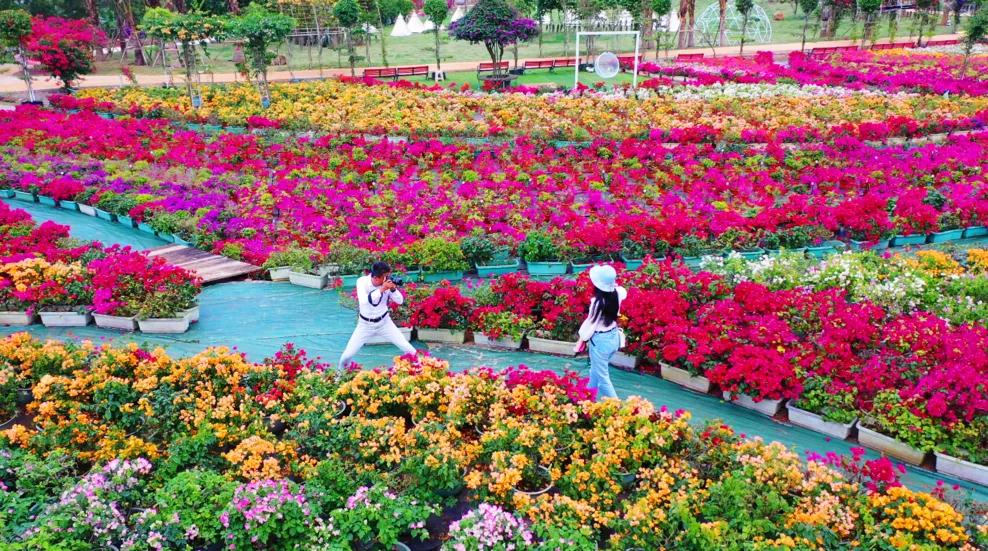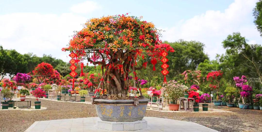 说明:百年植树,十年育花:这棵花王是金雀、红雀、橙雀、粉红雀、婴儿玫瑰等五种三角梅品种生长在同一百年树桩上五彩斑斓,一树多花,每年开花20万朵。在新的一年里来这里,在百年三角梅花王下,系上许愿绸带,虔诚祈祷为新的一年行好运,把三角梅的热情、坚韧和顽强的精神融入到生活中。