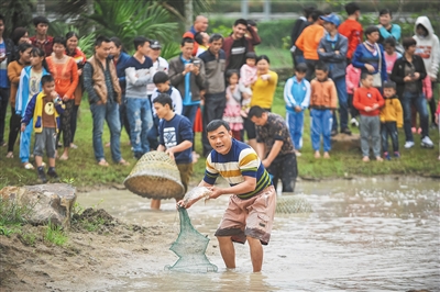 文昌市潭牛镇大庙村,游客在体验捕鱼。本报记者 袁琛 摄