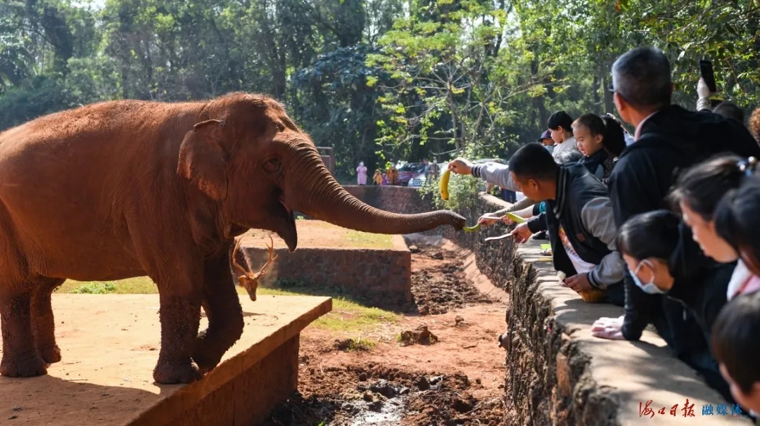 元旦假期,市民游客在海南热带野生动植物园与大象“亲密接触”。海口日报记者 苏弼坤 摄