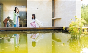 3月19日下午,在瑶城村民宿,两名穿着汉服的姑娘在民宿的茶室边“打卡”留念。 本报记者 陈长宇 摄
