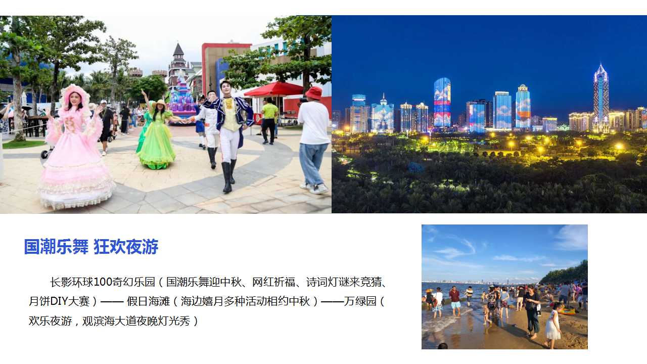 “惠”玩才欢乐,今年中秋国庆,遇见海野二十五周年庆主题系列活动及25周年文创套餐,长影环球100奇幻乐园的“月满照团圆,家合纳福欢”礼遇,海口火山口公园的月饼免费送,东寨港红树林旅游区“晒照片、送船票”活动等让你的欢乐加码。