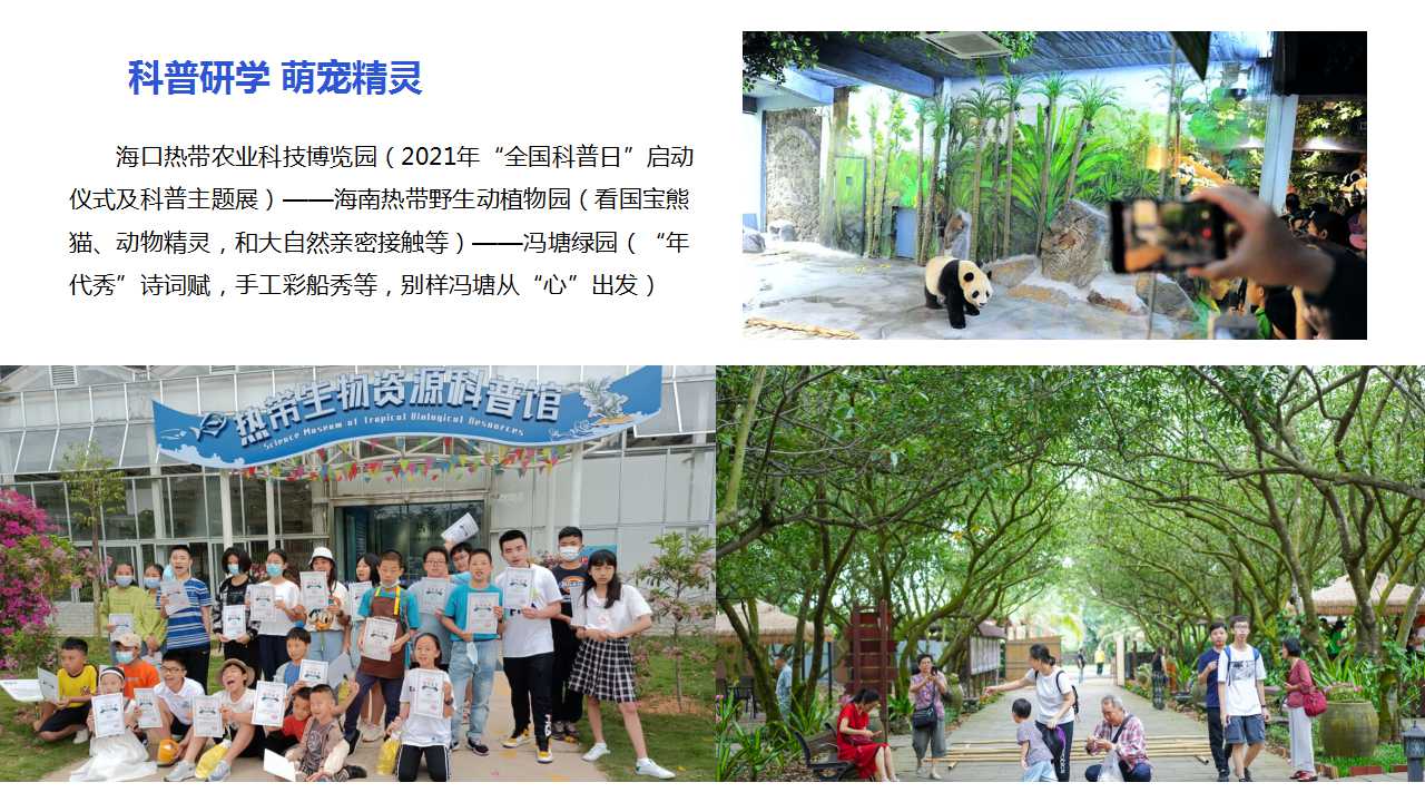 以玩水为主题的海口狂欢水世界,小黄鸭的奇幻漂流活动、青年爱国“潮计划”——狂欢水世界国庆潮酷嘉年华让你活力恢复满格。在海口热带农业科技博览园,海南省2021年“全国科普日”及科普主题展、六大科普展馆,将带领孩子们探索热作奥秘,漫步科学殿堂。