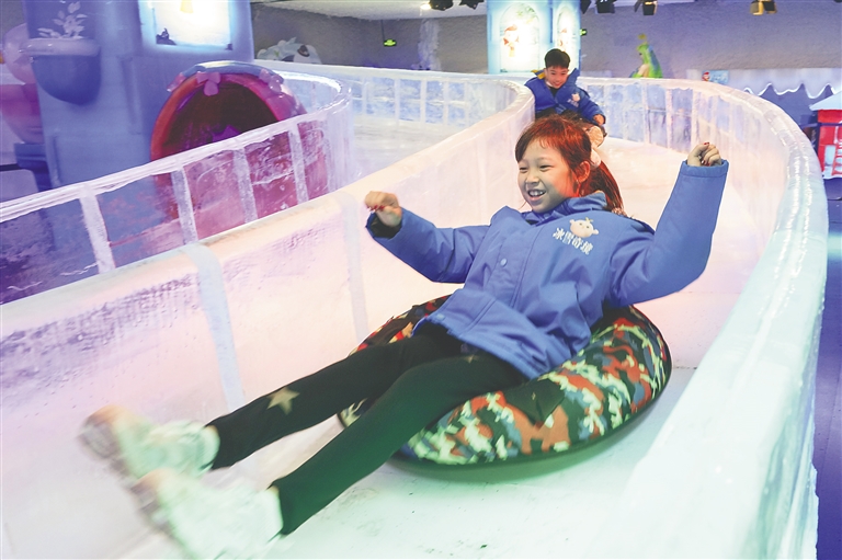 2月2日,游客在呀诺达景区“冰雪奇境”中体验冰雕滑梯。 本报记者 武威 摄
