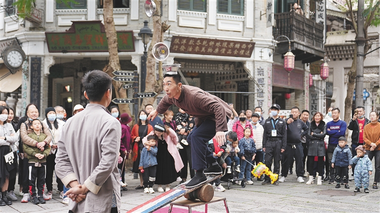 二月四日,海口电影公社中的杂技表演吸引不少游客观看。本报记者 张茂 摄