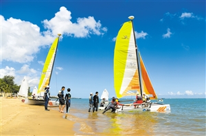 9月19日,中秋节假期首日,海口市西秀海滩碧海蓝天,只只帆影在海面上畅游,到海边体验亲水运动正成为众多市民游客假日游玩的热门选择。 本报记者 王程龙 摄