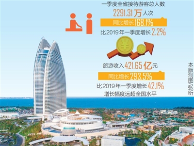 在国内游复苏的赛道上,海南旅游人气不可小觑。海南日报记者22日从省旅文厅获悉,一季度全省接待游客总人数2291.31万人次,同比增长168.1%,比2019年一季度增长2.2%;旅游收入421.65亿元,同比增长293.5%,比2019年一季度增长42.1%,增长幅度远超全国水平,全省旅游经济实现首季度“开门红”。