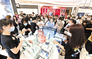 在海口日月广场,市民游客在免税店选购免税商品。 本报记者 张俊其 摄