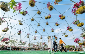 ▲市民游客在琼山区红旗镇三角梅共享农庄内参观游览。 本报记者 康登淋 摄