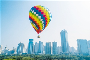 市民游客在海口万绿园乘坐热气球观赏城市地标建筑。 本报记者 石中华 摄