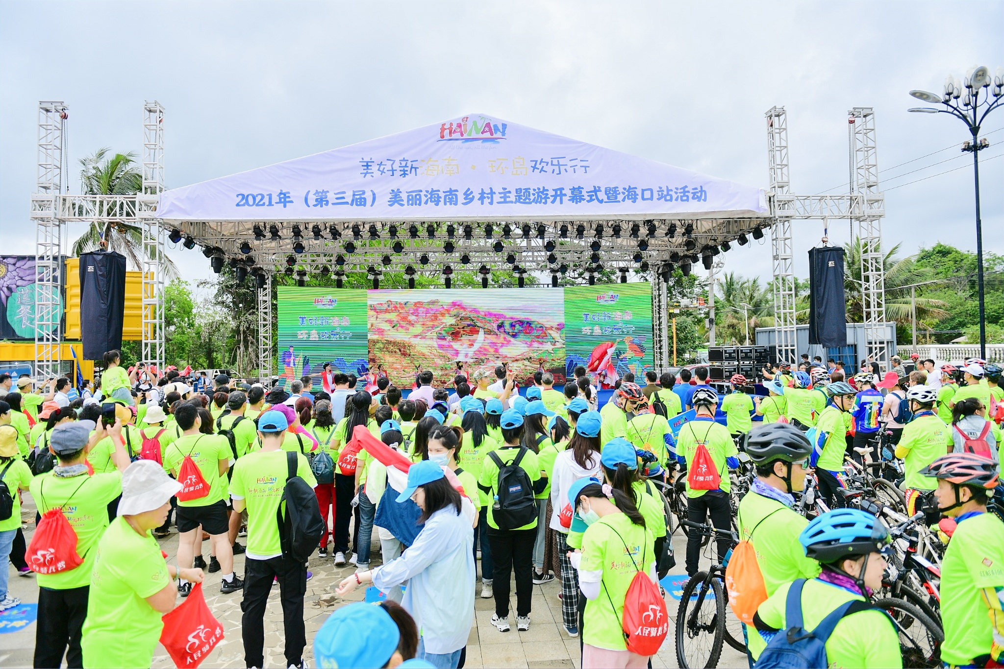 4月10日上午,由海南省旅游和文化广电体育厅主办,海口市旅游和文化广电体育局协办、海口市美兰区旅游和文化体育局支持、海南骑兵营体育旅游产业发展有限公司承办的“美好新海南•环岛欢乐行”2021年(第三届)美丽海南乡村主题游活动开幕式暨海口站活动,在海口市美兰区演丰镇演东村委会芳园国际艺术村开幕。海南省各大涉旅企业以及来自全国各地的游客徒步、骑行爱好者共500余人齐聚于此,领略美兰区江东生态美景。