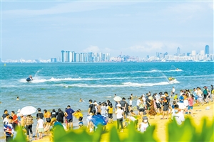 一大早,不少游客携家带口来到海口假日海滩,漫步沙滩,感受椰风海韵。在海口市国家帆船基地公共码头,踏浪出行,畅游水上,体会海口时尚玩海。无论是“水上飞龙”、摩托艇,还是乘风破浪的游艇帆船出海……多种玩海方式让大家尽享生态海洋魅力。
