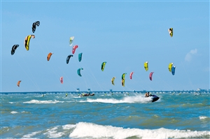 ②水上项目刺激了群众体育旅游消费。图为亲水运动季风筝冲浪赛现场(资料图)。