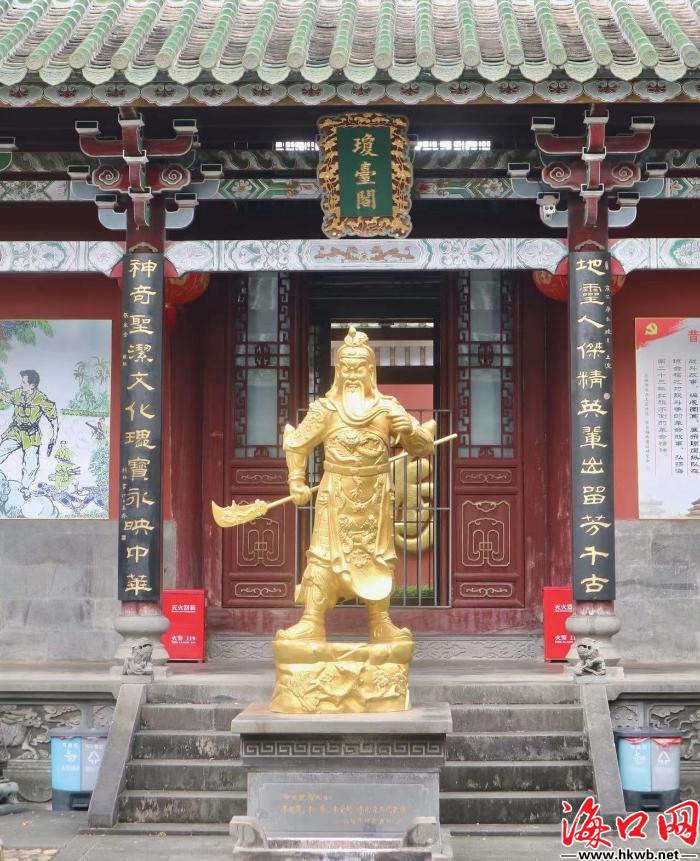 台阶两旁的每个柱头上都有一头栩栩如生的小石狮雕像,共十五对。拾级而上,福地轩大门两旁悬挂“琼台胜境旖旎扬天下,福地丰碑峥嵘耀海南”牌匾。穿过福地轩,便是琼台阁,走进翠竹葱茏的庭院,威风凛凛的金色关帝像跃入眼帘。
