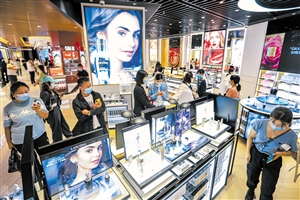 ④在海口海控全球精品免税城,品类众多的免税品吸引众多游客前来选购。