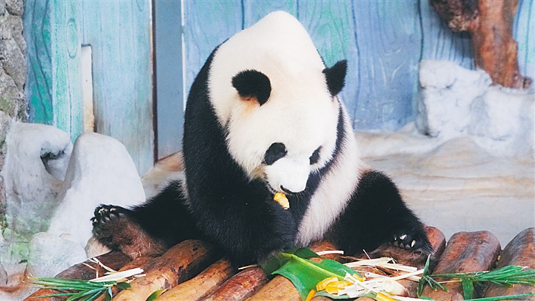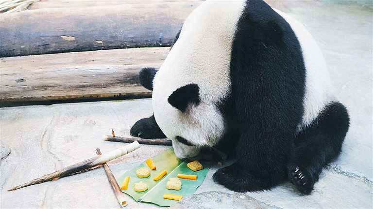 熊猫舜舜在品尝月饼。 见习记者 封烁 摄