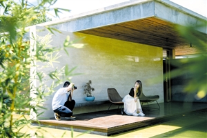 ◀在瑶城村,两名游客在民宿附近拍照游玩。 本报记者 陈长宇 摄