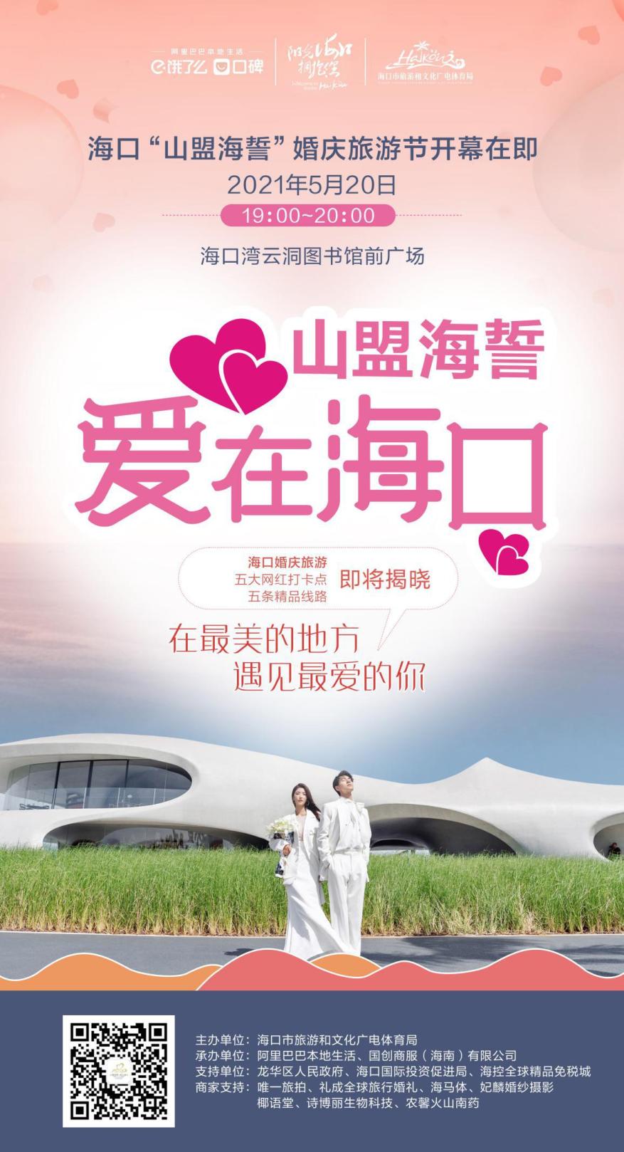 在最美的地方,遇见最爱的你。2021年5月20日19时,海口“山盟海誓”婚庆旅游节在海口湾云洞图书馆前广场盛大开启。许下山盟海誓,从此相濡以沫,与你共赴此生。启动仪式现场,海口将发布5大婚庆旅游网红打卡点和5条婚庆旅游线路。本次婚庆旅游节由海口市旅游和文化广电体育局主办,阿里巴巴本地生活和国创商服(海南)有限公司承办。