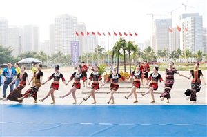 ①12月10日,在海南国际会展中心门前进行的欢迎舞蹈表演。