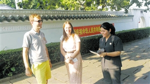 琼山区法院干警为两名外国游客提供法律服务。通讯员 宁会钦 摄