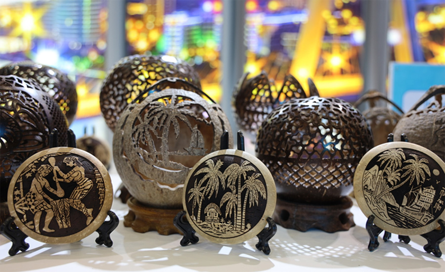 在海口展馆现场,有着“天南贡品”雅号的非遗椰雕展示。以椰壳为原料,雕刻成各种精美的工艺品,样式新颖,造型古朴,画面雅致,质地轻巧,融观赏性与实用性于一体,具有浓郁的海南风格。