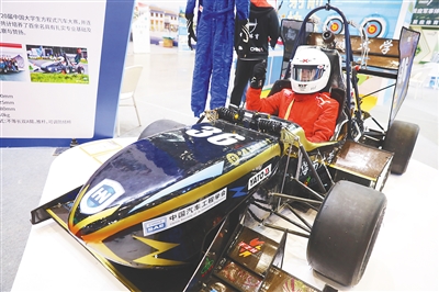 由海南大学生研发组装的中国2021赛季36号大学生方程赛车在体博会上展出。