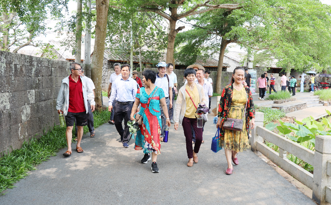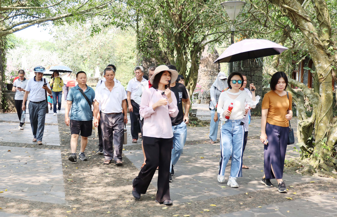 家长们或结伴到龙栖谷栈道上听潺潺流水声,或到古村里拾遗。透过火山石垒成的矮墙,欣赏着花开正艳的热带植物,在绿意环绕的村道上徒步更加惬意。