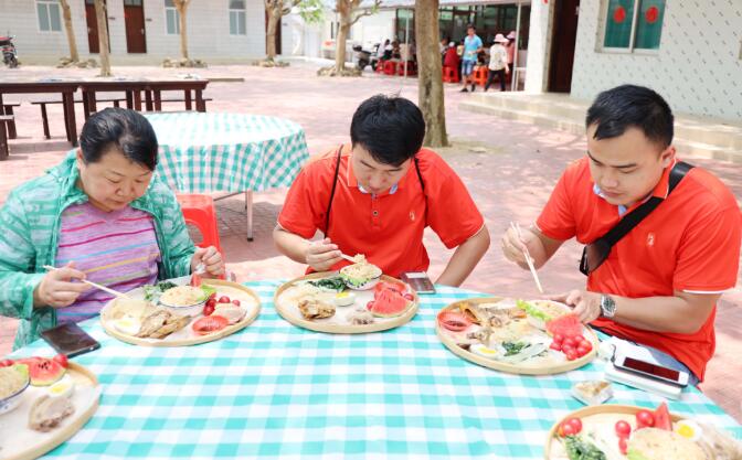 采摘之余,首发团一起在文山村吃起特色的“公道餐”,竹编餐盘,每人一份的分餐制,让玩累了的游客朋友们吃的喷喷香。
