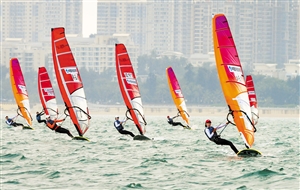 ②海口推进体育旅游融合发展,进一步带动消费。图为角逐激烈的帆船联赛。