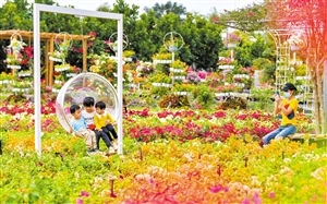 ⑥海口不断提升特色旅游产品供给。图为游客在三角梅共享农庄给孩子拍照留念。