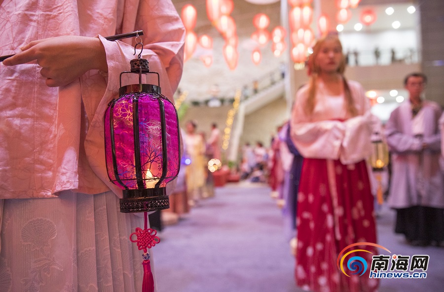 手挑花灯、身穿汉服的少男少女在省博物馆内表演传统的祭月仪式。海报集团全媒体中心记者 宋国强 摄