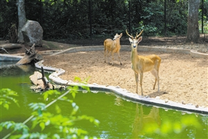 ▲坡鹿在水池边悠闲纳凉。