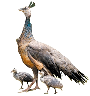 ◀孔雀妈妈带着刚出生不久的孔雀宝宝散步。