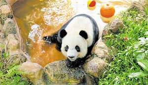 ▲憨态可掬的熊猫在户外水池洗澡降暑。