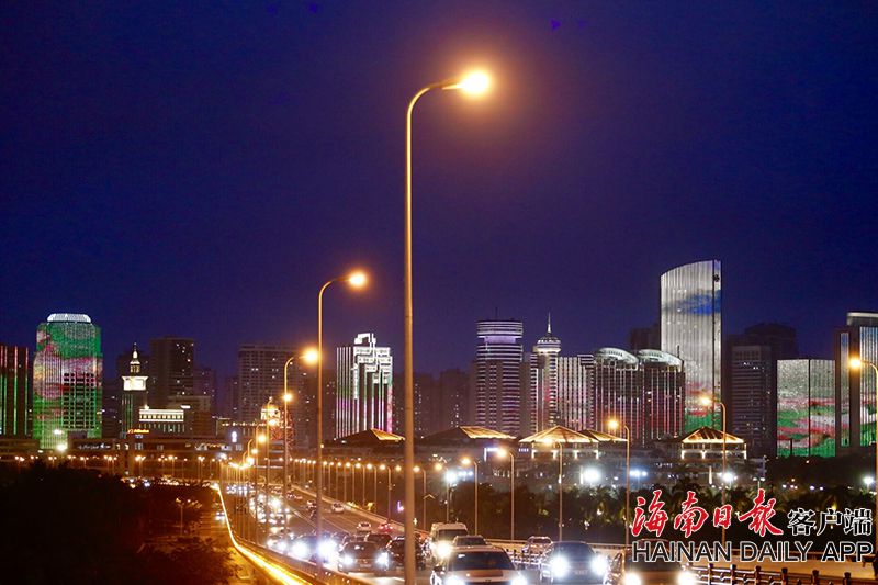 3月4日,入夜的海口凉风习习,海口滨海大道沿线的楼宇格外醒目。随着夜幕降临,绚丽的灯光秀仿佛春天的“嫁衣”,将滨海大道打扮得漂漂亮亮。从世纪大桥上望去,宛若一幅美丽的画卷。海南日报客户端记者 陈若龙 摄