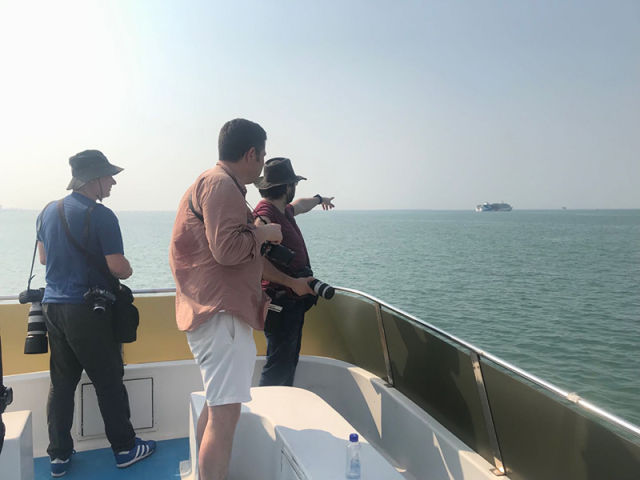 ↑外媒记者乘船欣赏海口风光。