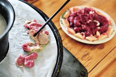 一锅两吃,是本地人最流行的牛肉烹调方法。一口子母锅摆在桌上,子锅烹煮着清甜的牛肉高汤,用来涮牛肉。母锅则铺上烧烤纸,涂上一层薄薄的定安花生油,将腌制过的牛肉放在锅上煎炒十余秒,空气中便弥漫着勾人的肉香。