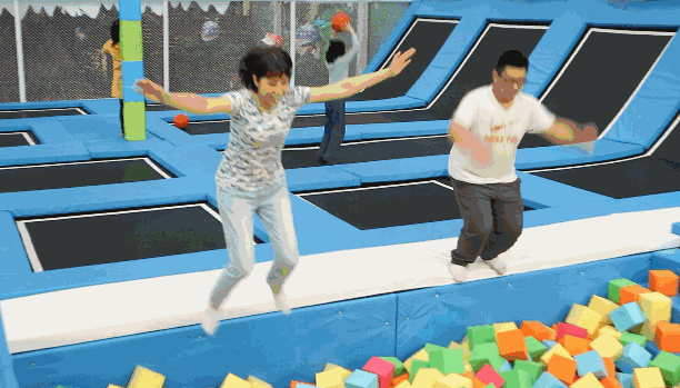 在蹦床上体验飞翔的快乐。