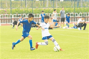 ▶5月1日,青少年在海口市五源河体育场进行足球比赛。 本报记者 石中华 摄