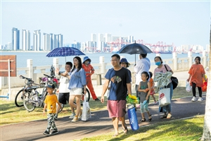 市民游客在海口西海岸悠闲散步。