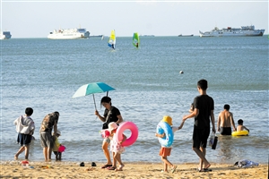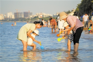 市民游客在海口假日海滩戏水。