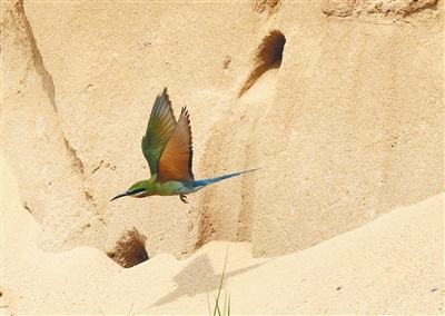 今年3月29日,为了让蜂虎继续在五源河下游繁殖,秀英区湿地保护管理中心在五源河下游为蜂虎营造栖息地。栖息地营造完成后,吸引了许多蜂虎在此筑巢。
